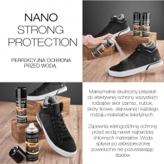 Nowa formuła wyjątkowo skutecznego impregnatu w sprayu, chroniącego wszystkie rodzaje obuwia skórzanego, zarówno ze skór licowych, łączonych, jak i nubuków, zamszu, skór sztucznych, tekstylnych oraz odzież sportową czy parasole.
