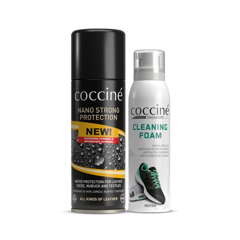 Podstawowy zestaw do pielęgnacji butów. Aktywna pianka czyszcząca usuwa zabrudzenia i pozostałości starych powłok środków pielęgnujących. Skuteczny impregnat utrwala czystość powierzchni obuwia oraz zabezpiecza przed przemoczeniem i przywieraniem nowego brudu i kurzu.