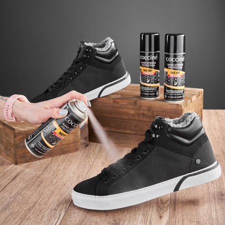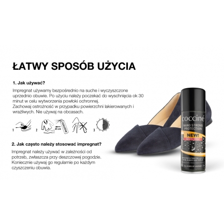Nowa formuła wyjątkowo skutecznego impregnatu w sprayu, chroniącego wszystkie rodzaje obuwia skórzanego, zarówno ze skór licowych, łączonych, jak i nubuków, zamszu, skór sztucznych, tekstylnych oraz odzież sportową czy parasole.