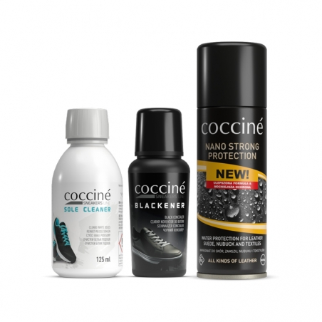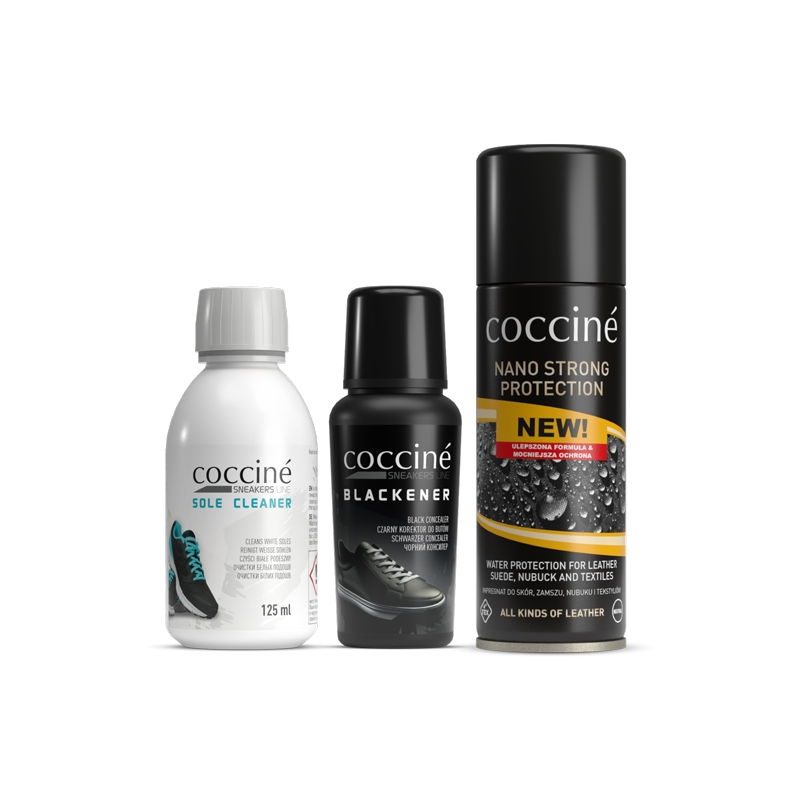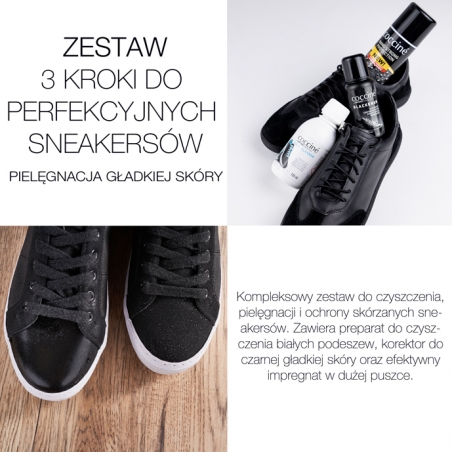 Kompleksowy zestaw do czyszczenia, pielęgnacji i ochrony skórzanych sneakersów. Zawiera preparat do czyszczenia białych podeszew, korektor do czarnej gładkiej skóry oraz efektywny impregnat w dużej puszce.