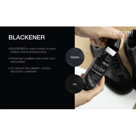 SNEAKERS BLACKENER to czarny korektor w płynie, który doskonale niweluje drobne przetarcia skóry. Wyrównuje i pogłębia czarny kolor, przywraca połysk. Do czarnych skór gładkich, tworzyw sztucznych i podeszw.