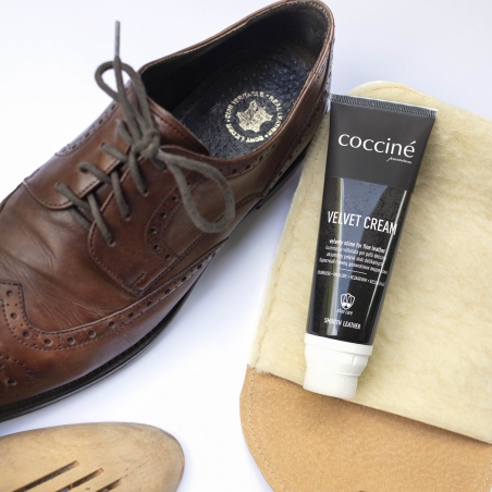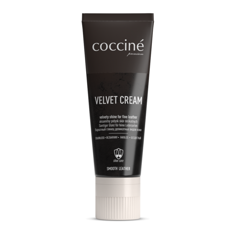 Krem bezbarwny w tubie o nowoczesnej formule przygotowany z myślą o szlachetnych, delikatnych skórach trudnych do pielęgnacji przez tradycyjne środki. Zaleca się stosowanie do skór typu Velvet, do skór przecieranych, delikatnych skór buffalo z tendencją do łatwego ciemnienia, miękkich skór cielęcych o jedwabnym licu. Format tuby z aplikatorem pozwala na łatwą aplikację kremu na obuwie i galanterię, teczki, torebki. Velvet cream nadaje piękny aksamitny połysk, nie przyciemnia chłonnych skór, zachowuje ich oryginalny wygląd, a przy tym polwleka ochronną warstwą wosków i żywic.